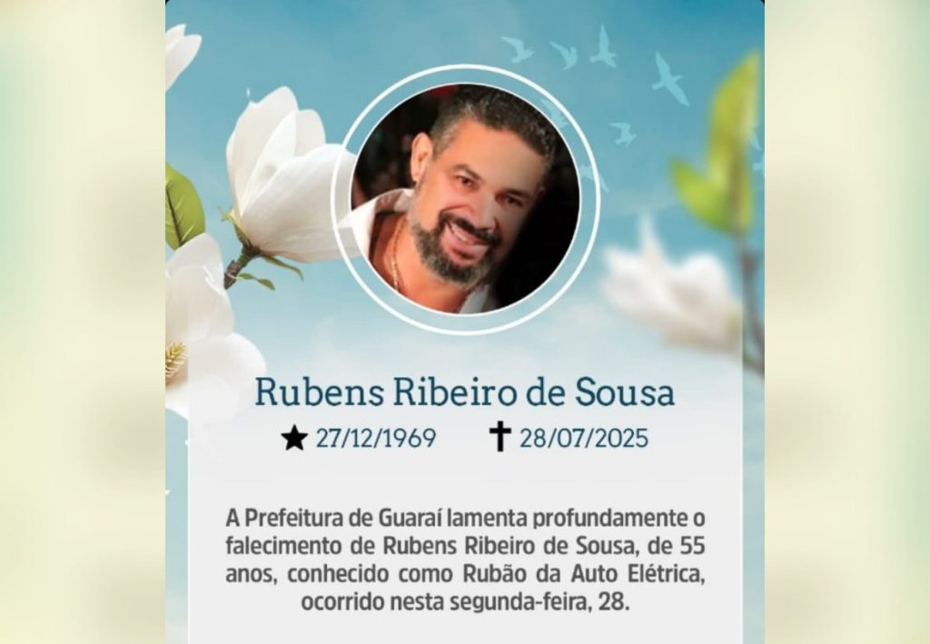 A Prefeitura de Guaraí publicou uma nota de pesar nas redes sociais, lamentando a morte do comerciante e se solidarizando com amigos e familiares. “Comerciante há muitos anos no município. Rubão era esposo da vereadora Rita Lopes e deixa três filhos e dois netos”, diz a nota.