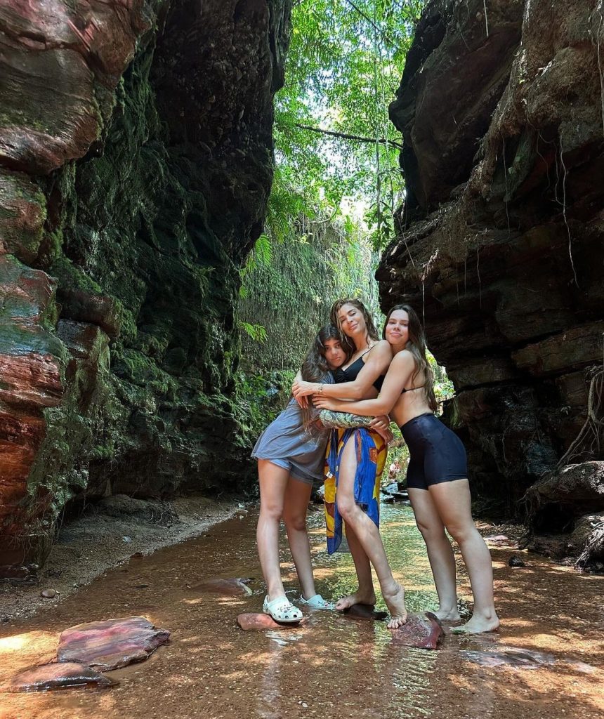 Nos stories, a atriz também compartilhou momentos aproveitando a cachoeira com a legenda ‘Sensação de estar no paraíso’. Em outro momento, por causa do sinal da internet, o grupo teve que se reunir em um espaço para conseguir conectar os celulares.