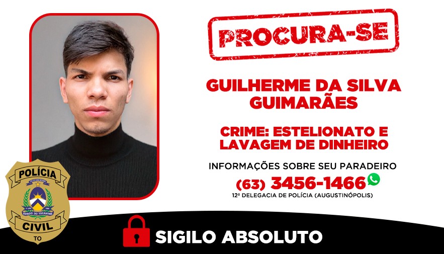 Participe do canal do g1 TO no WhatsApp e receba as notícias no celular.Nesta quinta-feira (7), a Secretaria de Segurança Pública (SSP) divulgou um cartaz de procurado com a foto de Guilherme. Ele tem mandado de prisão em aberto pelos crimes de estelionato e lavagem de dinheiro. Quem tiver informações sobre o paradeiro dele deve entrar em contato com a polícia.