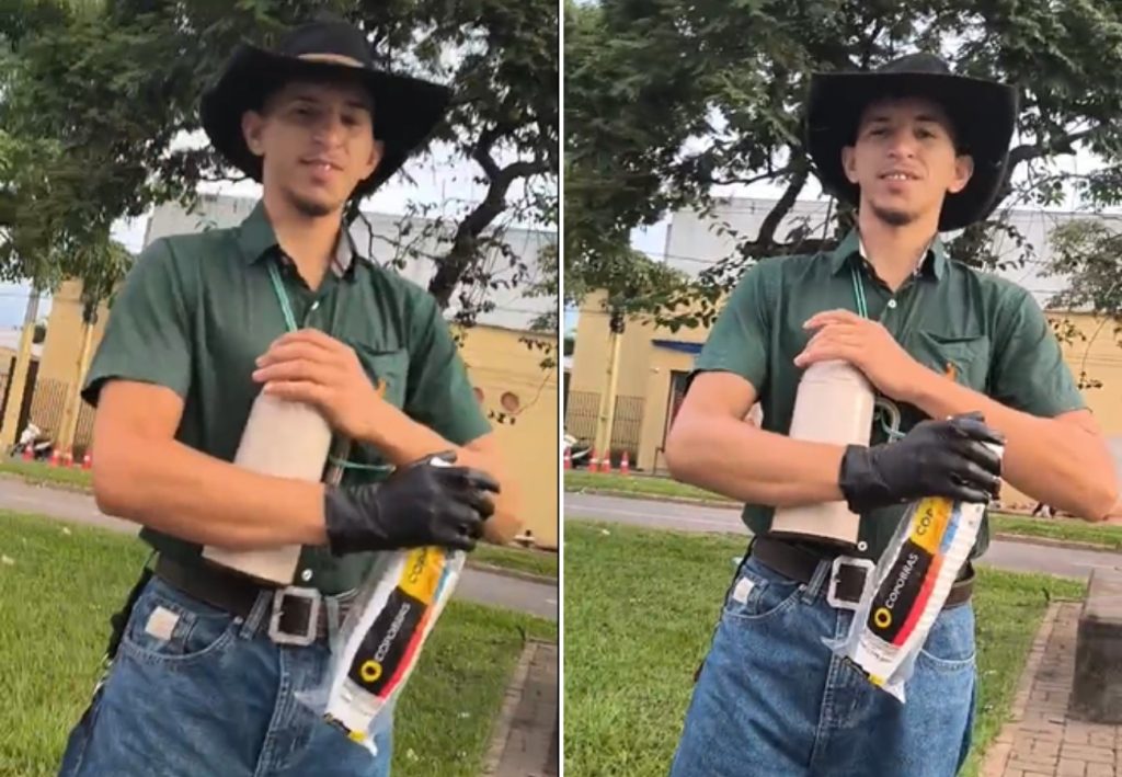 Com fivela no cinto, chapéu e botas, ele chama atenção no semáforo como o “Cowboy do Café”. O método facilita a vida dos condutores que passam pelo local em horário de pico.